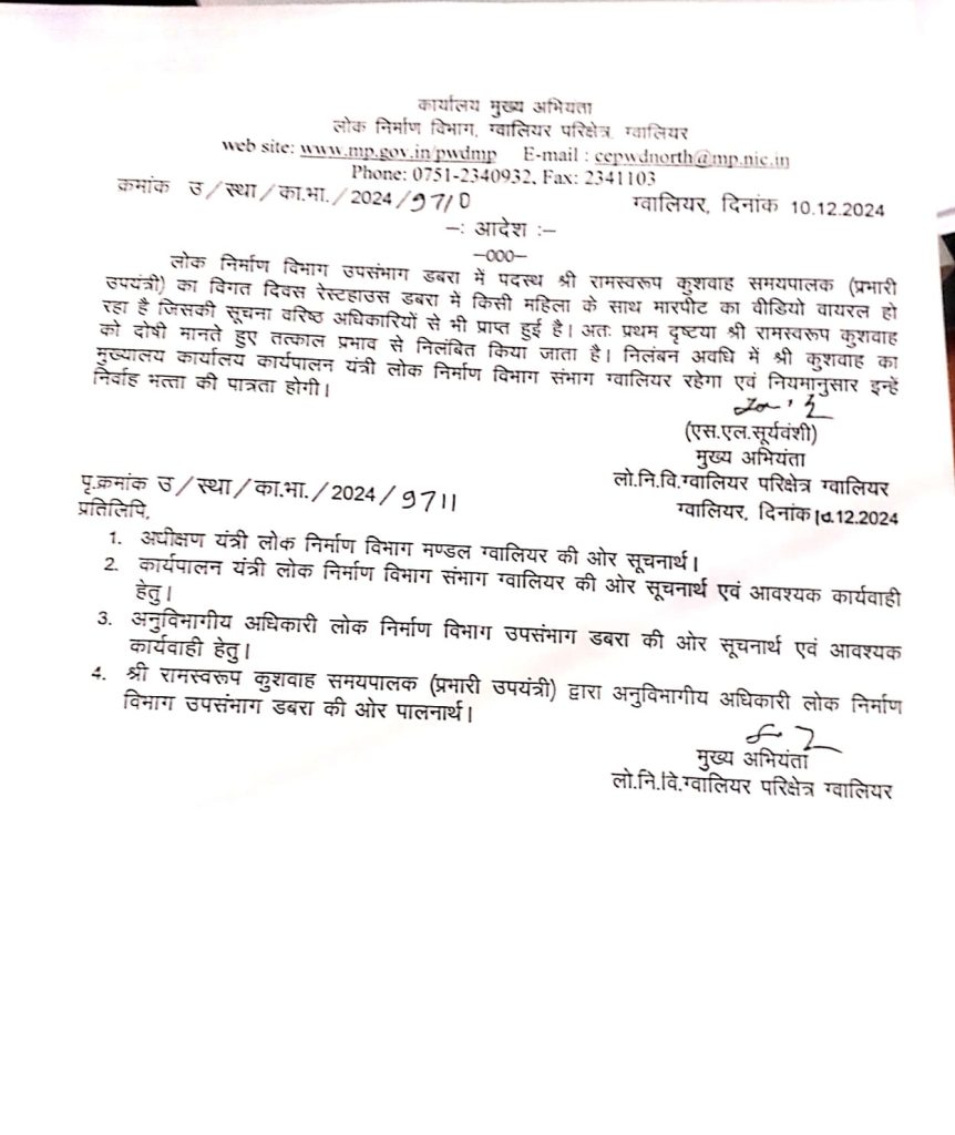 सतीश दुबे, डबरा। मध्य प्रदेश में लल्लूराम डॉट कॉम की खबर का एक बार फिर बड़ा असर हुआ है। नौकरी दिलाने के बहाने युवती को रिसॉर्ट बुलाकार सेक्स की डिमांड करने वाले PWD के सब इंजीनियर रामस्वरूप कुशवाह को सस्पेंड कर दिया गया है। लल्लूराम डॉट कॉम ने प्रमुखता से इस खबर को प्रकाशित किया था और पिटाई का वीडियो उच्च अधिकारियों तक पहुंचाया था। जिसके बाद मुख्य अभियंता ने उन्हें निलंबित कर दिया है।