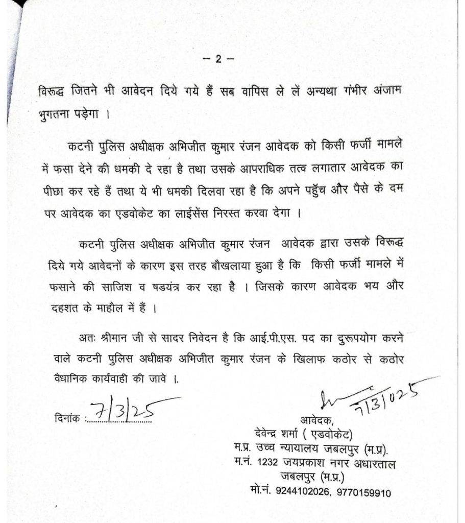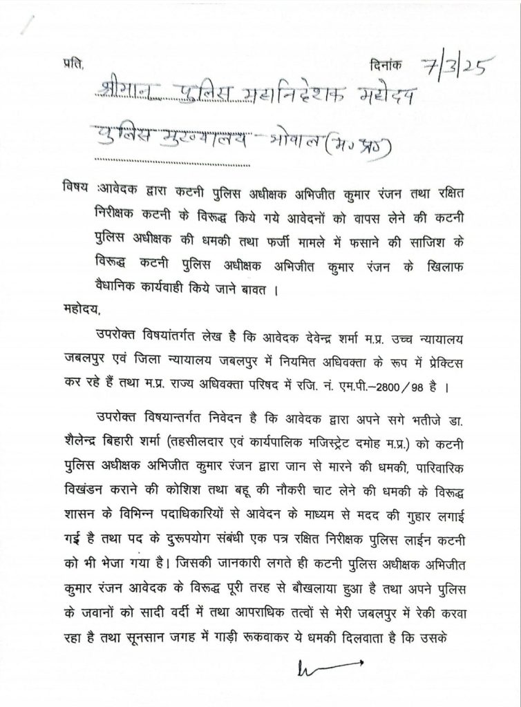 पीड़ित के चाचा अधिवक्ता देवेंद्र शर्मा ने भी DGP को एक पत्र लिखा है। उन्होंने आवेदन में लिखा है कि “भतीजे डा. शैलेन्द्र बिहारी शर्मा (तहसीलदार एवं कार्यपालिक मजिस्ट्रेट दमोह म.प्र.) को कटनी पुलिस अधीक्षक अभिजीत कुमार रंजन ने जान से मारने की धमकी है। पारिवारिक विखंडन कराने की कोशिश कर बहू की नौकरी चाट लेने की धमकी भी दी है।”