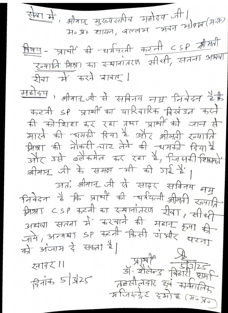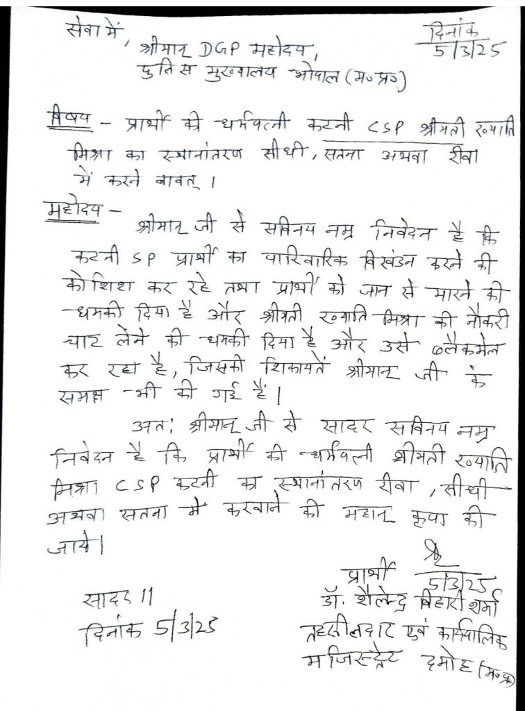 दरअसल, कटनी सीएसपी ख्याति मिश्रा के पति डॉ. शैलेन्द्र बिहारी शर्मा वर्तमान में दमोह में तहसीलदार एवं कार्यपालिक मजिस्ट्रेट दमोह के पद पर कार्यरत हैं। उनका DGP को लिखा एक कथित पत्र सोशल मीडिया पर वायरल हो रहा है, जिसमें उन्होंने कहा है कि कटनी एसपी अभिजीत कुमार रंजन मेरे परिवार का विखंडन करने की कोशिश कर रहे हैं। उन्होंने मुझे जान से मारने की धमकी दी है। साथ ही मेरी पत्नी की नौकरी चाट जाने की धमकी दी है। पीड़ित ने CSP पत्नी का सतना, रीवा या सीधी में करने की मांग की है।