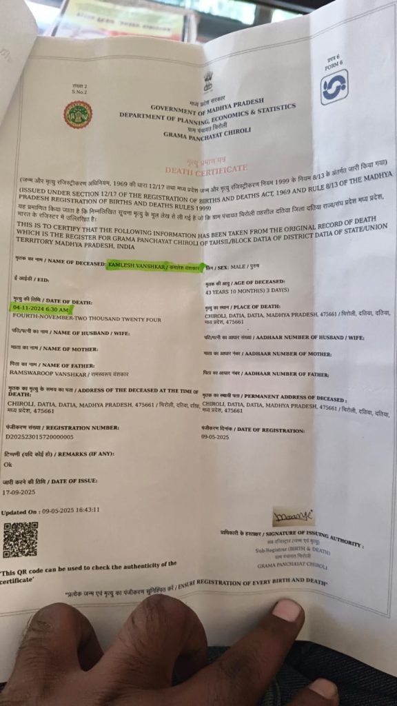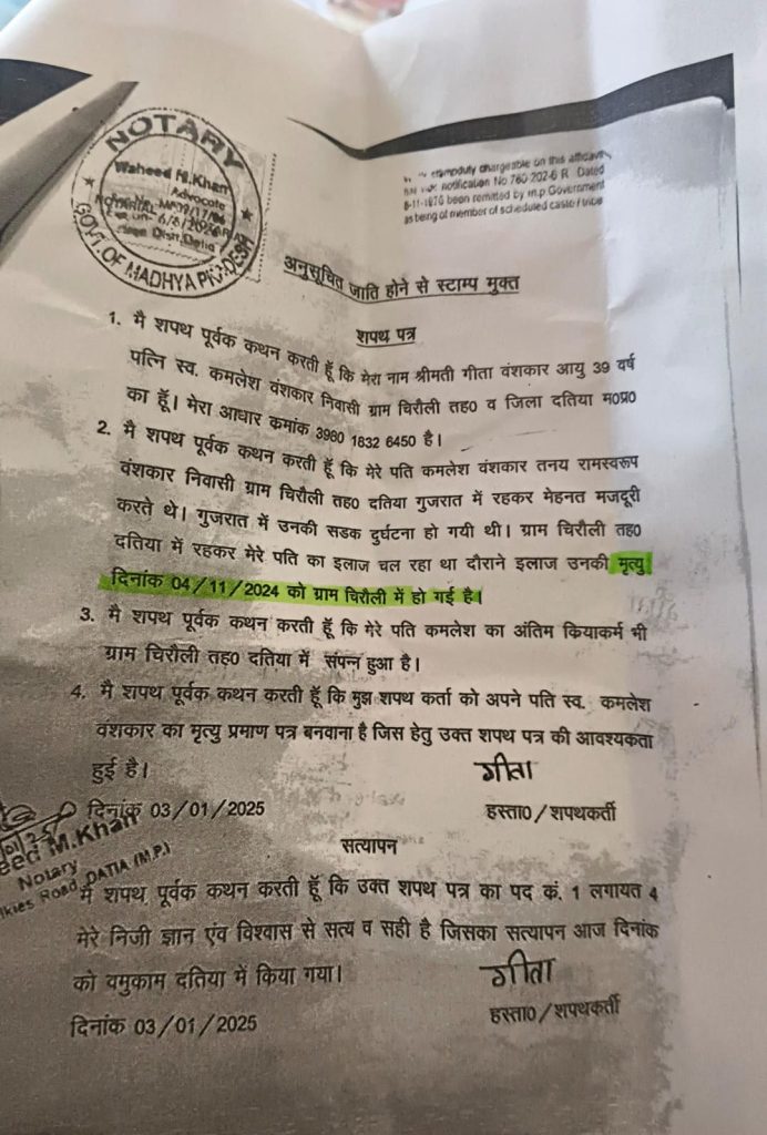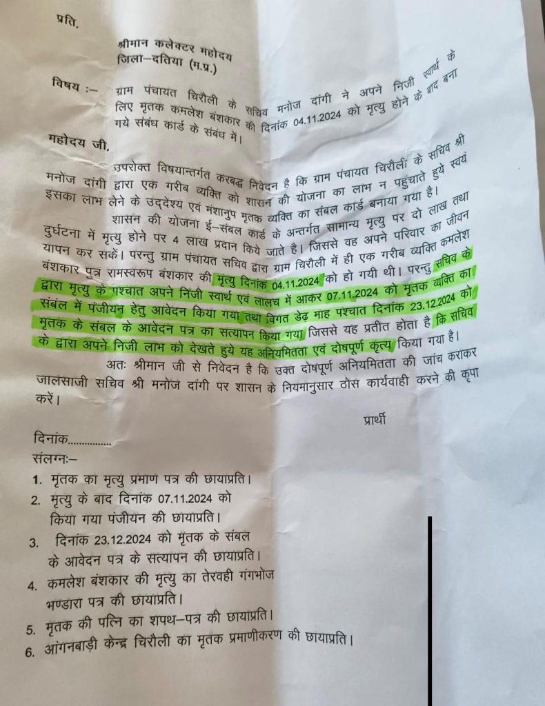 दरअसल, यह अनोखा मामला ग्राम पंचायत चिरौली से सामने आया है। जहां कमलेश वंशकार का निधन 4 नवंबर 2024 को हो चुका था। लेकिन सचिव मनोज दांगी ने 7 नवंबर को उन्हीं के नाम से संबल योजना का आवेदन भर दिया और 23 दिसंबर को बाकायदा सत्यापन भी कर दिया।