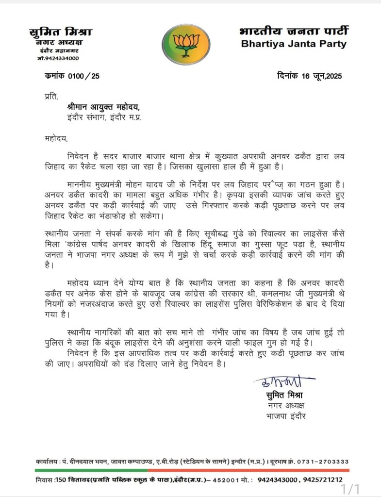 हेमंत शर्मा, इंदौर। लव जिहाद के लिए फंडिंग मामले का खुलासा होने के बाद बीजेपी कांग्रेस पार्षद अनवर कादरी पर हमलावर है। बीजेपी नगर अध्यक्ष सुमित मिश्रा ने पार्षद कादरी पर कार्रवाई करने और रिवाल्वर का लाइसेंस निरस्त करने की मांग की है। मामले को लेकर उन्होंने इंदौर पुलिस कमिश्नर को पत्र लिखा है।