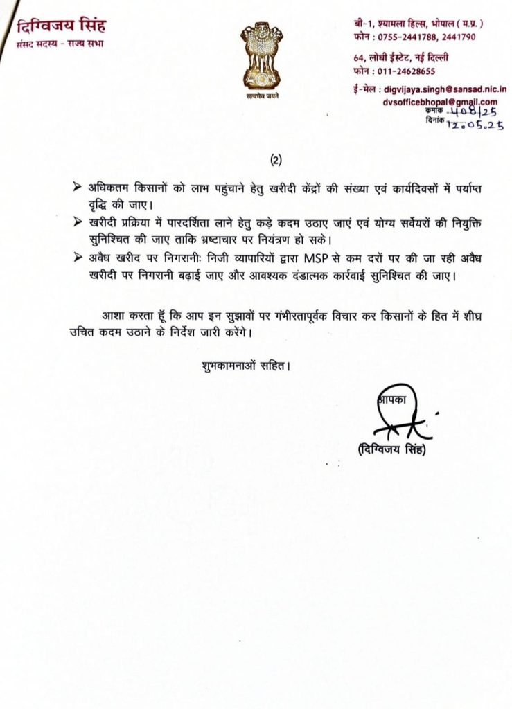 राज्य में इस वर्ष मूंग का रकबा 14.5 लाख हेक्टेयर तक पहुँचा है। कुल उत्पादन लगभग 20 से 21 लाख टन आंका गया है। यह न केवल किसानों की मेहनत का प्रमाण है, बल्कि प्रदेश को देश के अग्रणी मूंग उत्पादक राज्यों में स्थापित करने की दिशा में एक बड़ा कदम भी है। मूंग की यह फसल किसानों की वार्षिक आमदनी में उल्लेखनीय वृद्धि कर सकती है। MSP पर खरीदी की व्यवस्था में गंभीर कमियों का दिग्विजय सिंह ने जिक्र किया है। प्राप्त शिकायतों के अनुसार, करीब 75 प्रतिशत किसानों को अपनी उपज न्यूनतम समर्थन मूल्य से कम दरों पर बेचनी पड़ी है।