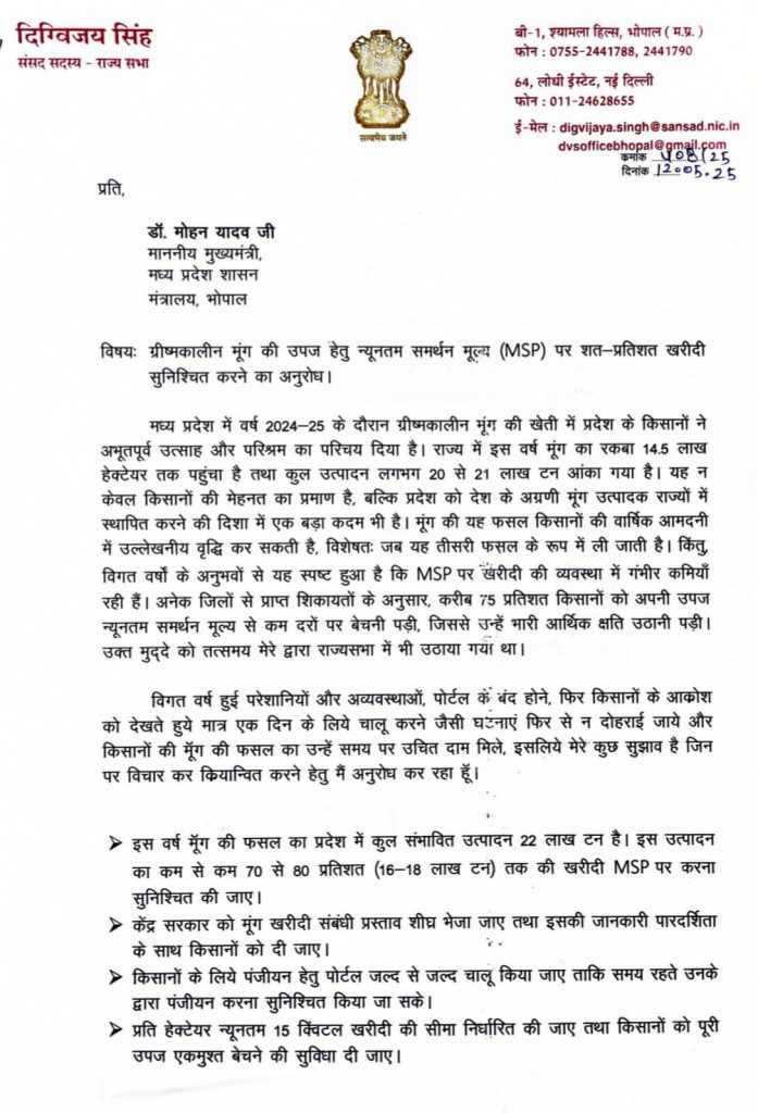 शिखिल ब्यौहार, भोपाल। मध्यप्रदेश के पूर्व मुख्यमंत्री दिग्विजय सिंह ने सीएम डॉ मोहन यादव को पत्र लिखकर ग्रीष्मकालीन मूंग की उपज के लिए न्यूनतम समर्थन मूल्य (MSP) पर शत-प्रतिशत खरीदी का अनुरोध किया है। वर्ष 2024-25 के दौरान ग्रीष्मकालीन मूंग की खेती में प्रदेश के किसानों ने अभूतपूर्व उत्साह और परिश्रम का परिचय दिया है।