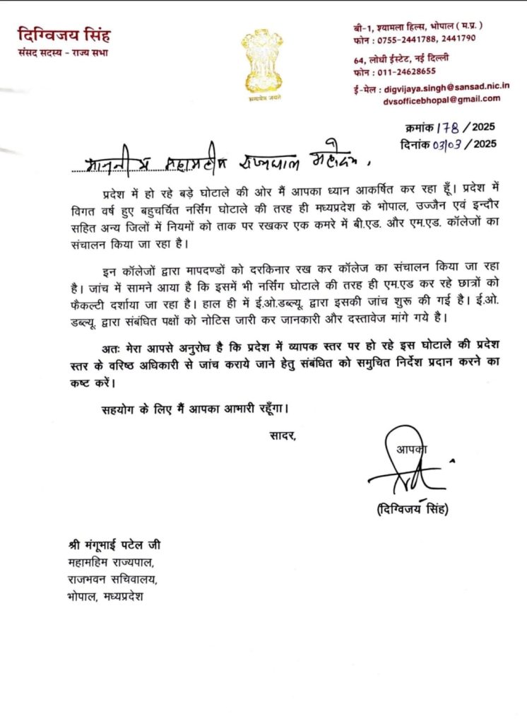 दिग्विजय सिंह ने पत्र में लिखा- बीएड और एमएड कॉलेजों में हो रहे घोटाले की ओर ध्यान आकर्षित करा रहा हूं। प्रदेश के