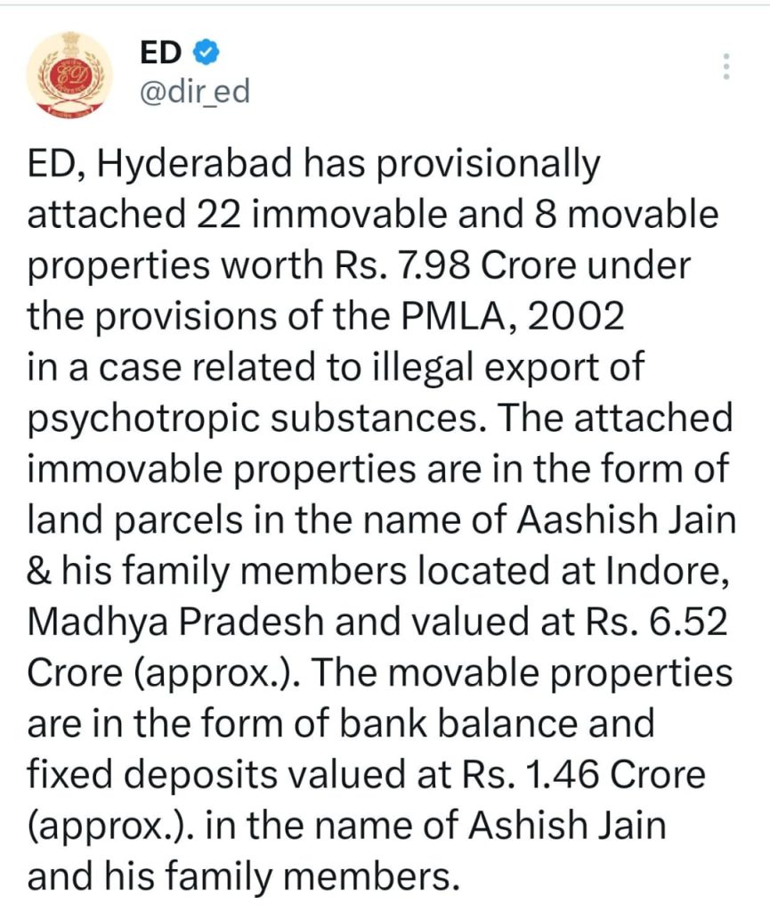 चंकी बाजपेयी, इंदौर। नशीली दवाओं के निर्यात मामले में ED (Directorate of Enforcement) ने मध्यप्रदेश समेत कई ठिकानों पर बड़ी कार्रवाई की है। ईडी (प्रवर्तन निदेशालय) ने नशीली साइकोट्रोपिक दवाओं के अवैध निर्यात मामले में 7.98 करोड़ की इंदौर सहित अलग अलग स्थानों की संपत्ति की कुर्क कार्रवाई की है। ईडी ने सोशल मीडिया में अपने अधिकृत साइट पर इसकी जानकारी दी है।