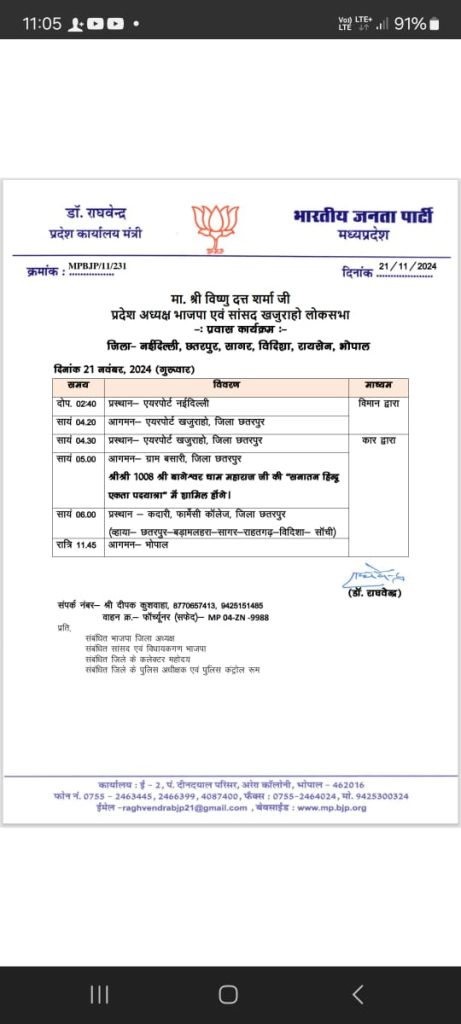 बीजेपी प्रदेश अध्यक्ष विष्णुदत्त शर्मा धीरेन्द्र कृष्ण शास्त्री के सनातन हिन्दू एकता पदयात्रा में शामिल होंगे। दोपहर 2:30 बजे दिल्ली से खजुराहो के लिए रवाना होंगे। शाम 4:30 बजे खजुराहो एयरपोर्ट पहुंचेंगे। एयरपोर्ट से कार द्वारा रवाना होंगे। शाम 5 बजे पद यात्रा में शामिल होंगे। शाम 6 बजे भोपाल के लिए प्रस्थान करेंगे।