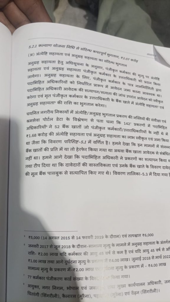 यह खुलासा भारत के नियंत्रक एवं महालेखा परीक्षक (Comptroller & Auditor General of India-CAG) कैग की एक रिपोर्ट में हुआ है। कैग रिपोर्ट में सरकारी जमीन आवंटन में भी गड़बड़ी की बात सामने आई है। भोपाल में अजीम प्रेमजी फाउंडेशन को नियम विरुद्ध जमीन आवंटित की गई जिससे 65.5 करोड़ राजस्व का नुकसान हुआ है। संबल योजना में भी गड़बड़ी सामने आई है। 67 लाख 48 हजार श्रमिकों को अपात्र किया गया है। संबल योजना के कुल 31 फीसदी अपात्र किया गया। इसी तरह अंत्येष्टि सहायता राशि में भी गड़बड़ी की गई है। श्रमसेवा पोर्टल के डाटा का विश्लेषण किया गया जिसमें 142 मामलों में 52 खातों में 1.68 करोड़ की राशि जमा की गई, ये खाते पंजीकृत श्रमिकों के नहीं थे। विवाह सहायता के 86 मामलों में बिना पंजीकृत श्रमिकों के 41 बैंक खातों में 38.92 लाख की राशि जमा की गई। ‘