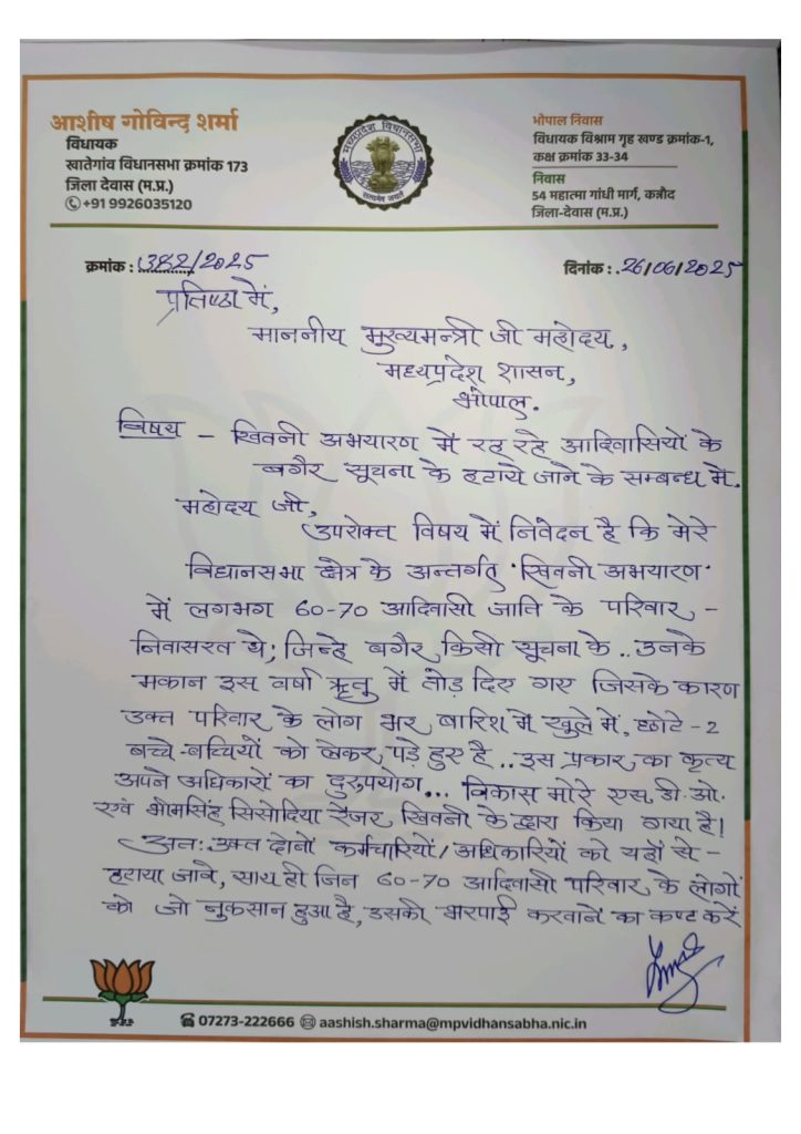 हर्षित तिवारी, खातेगांव (देवास)। जिले के खिवनी अभ्यारण्य में आदिवासियों को हटाने का मामला तूल पकड़ता जा रहा है। आदिवासियों को बिना सूचना के हटाए जाने मामले को लेकर विधायक न सिर्फ समर्थन में उतर गया है बल्कि कार्रवाई करने वाले वन विभाग के अधिकारी-कर्मचारियों के खिलाफ कार्रवाई की मांग की है। बीजेपी विधायक आशीष शर्मा ने खिवनी अभ्यारण्य एसडीओ (SDO) विकास मोरे, रेंजर भीमसिंह सिसौदिया को हटाने एवं पीड़ित परिवार को हुए नुकसान की भरपाई के लिए मुख्यमंत्री डॉ मोहन यादव के नाम पत्र लिखा है।