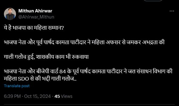 इस मामले में कांग्रेस नेता मिथुन अहिरवार ने सोशल मीडिया एक्स पर लिखा, ये है भाजपा का महिला सम्मान? भाजपा नेता और पूर्व पार्षद कामता पाटीदार ने महिला अफसर से जमकर अभद्रता की। गाली गलौज हुई, शासकीय काम भी रुकवाया। भाजपा नेता और बीजेपी वार्ड 84 के पूर्व पार्षद कामता पाटीदार ने जल संसाधन विभाग की महिला SDO से की भद्दी गाली गलौज।