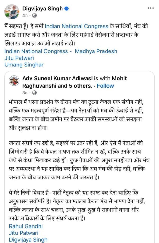 शब्बीर अहमद, भोपाल। अपने बेबाक बयानों के लिए सुर्खियों में रहने वाले मध्यप्रदेश के पूर्व सीएम दिग्विजय सिंह ने कांग्रेस नेताओं को आपस में नहीं लड़ने और गुटबाजी से दूर रहने की नसीहत दी है। दिग्विजय सिंह ने सोशल मीडिया पर एक पोस्ट किया है। उन्होंने लिखा- कांग्रेस के साथियों, मंच की लड़ाई समाप्त करो और जनता के लिए महंगाई, बेरोजगारी, भ्रष्टाचार के ख़िलाफ आवाज, उठाओ लड़ाई लड़ो। उन्होंने यह नसीहत एक कार्यक्रम में मंच पर अधिक संख्या में नेताओं के बैठ जाने और मंच गिरने को लेकर दी है।