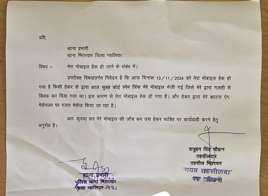 बता दें कि भितरवार में पदस्थ तहसीलदार शत्रुघ्न सिंह चौहान साइबर ठगी के शिकार हुए हैं. दरअसल, उसके मोबाइल पर एक स्पैम मैसेज आया था और उसने गलती से लिंक क्लिक हो गया. जिसके बाद मोबाइल हैंक हो गया और अकाउंट से 61000 रुपये गायब हो गए. जिसके बाद उन्होंने तुरंत थाने पहुंचे और आवेदन देकर शिकायत की. फिलहाल, पुलिस इस मामले में वैधानिक कार्रवाई कर रही है.