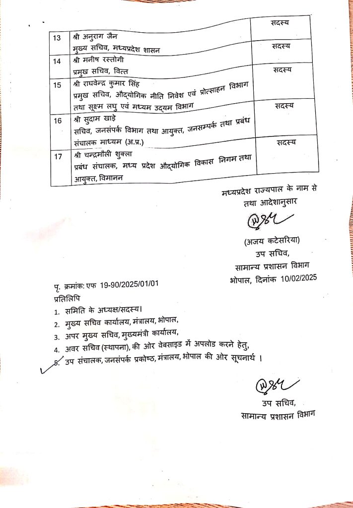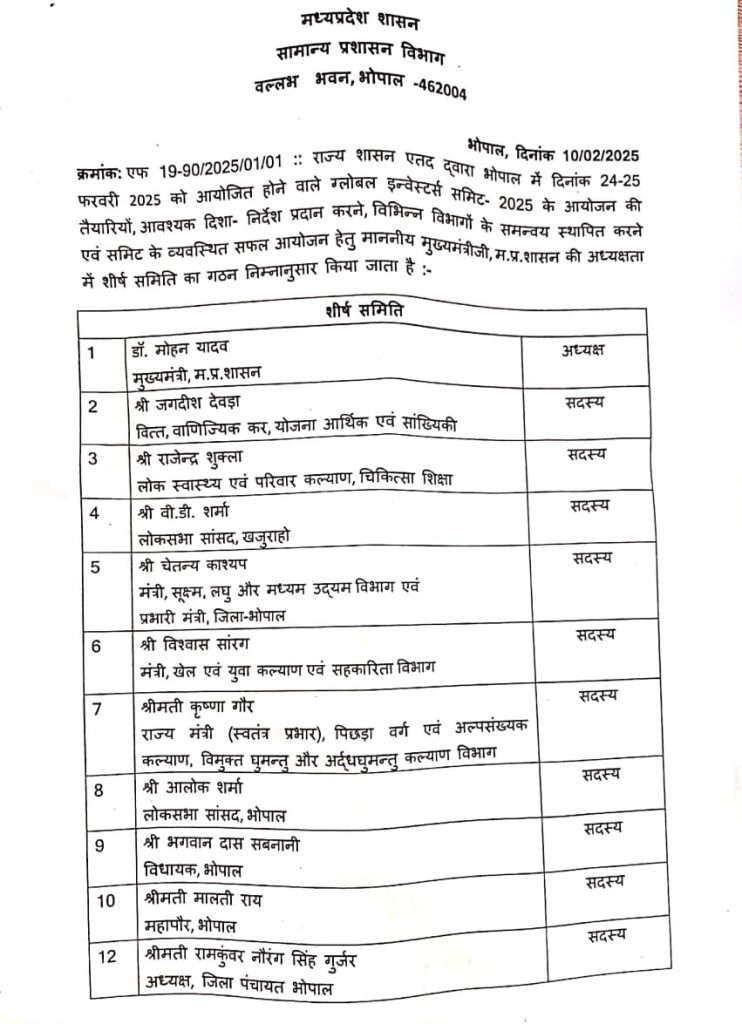 शब्बीर अहमद, भोपाल। मध्यप्रदेश में ग्लोबल इन्वेस्टर्स समिट की तैयारी को लेकर मुख्यमंत्री डॉ मोहन यादव की अध्यक्षता में समन्वय समिति का गठन किया गया है। समूह में दो डिप्टी सीएम, भोपाल के प्रभारी मंत्री, स्थानीय विधायक और मेयर को भी शामिल किया गया है। इस आशय का आदेश सामान्य प्रशासन विभाग ने जारी किया है।