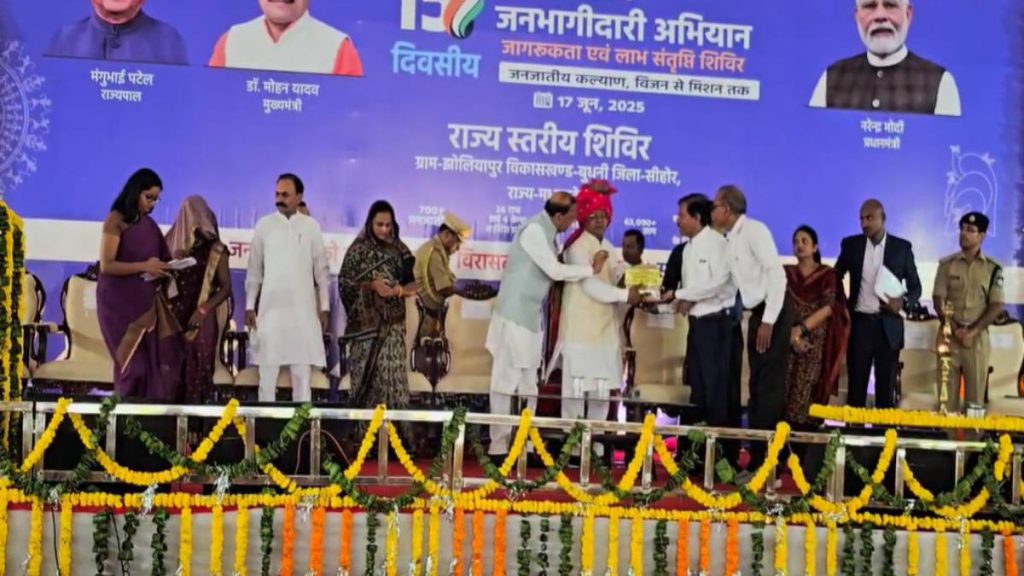 मुकेश मेहता, बुधनी (सीहोर)। मध्यप्रदेश के महामहिम राज्यपाल मंगू भाई पटेल मंगलवार को सीहोर जिले के रेहटी तहसील के ग्राम झोलियापुर पहुंचे। वे यहां आयोजित धरती आबा जन भागीदारी अभियान के कार्यक्रम में शामिल हुए। कार्यक्रम में ग्रामवासियों की ओर से राज्यपाल मंगू भाई पटेल का भावभीना स्वागत किया गया।