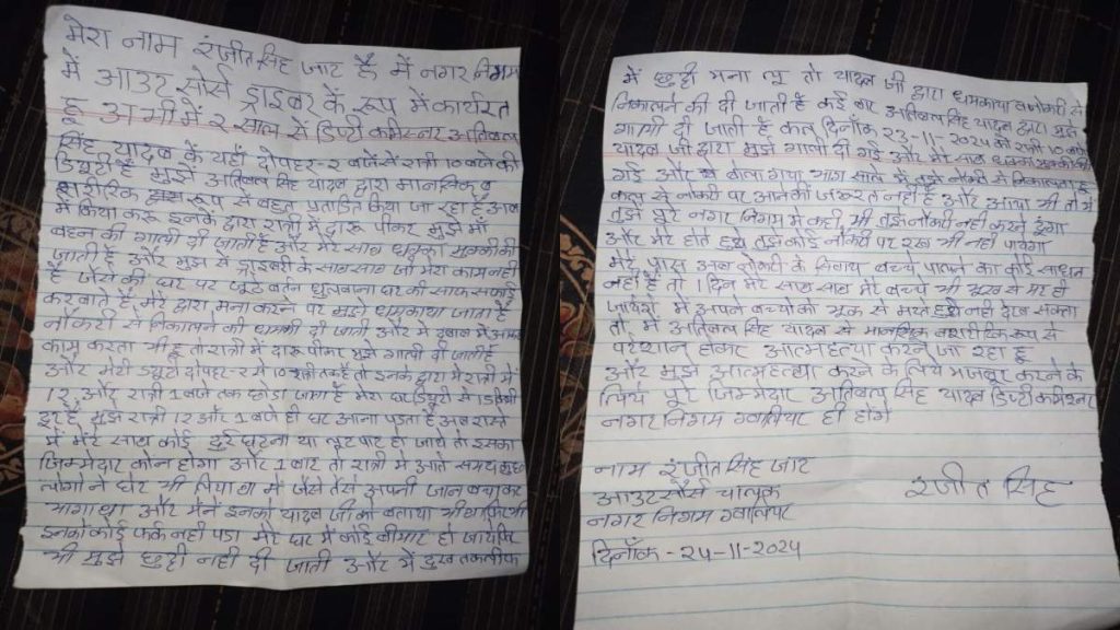 दरअसल, ग्वालियर के देहात बिजौली थाना क्षेत्र के बड़ागांव हाइवे स्थित अंशराज होटल के पीछे रहने वाला रंजीत सिंह जाट नगर निगम में आउटसोर्स कर्मचारी है. वह नगर निगम डिप्टी कमिशनर अतिबल सिंह यादव का वाहन चलाता है. रविवार-सोमवार दरमियानी रात 1 बजे रंजीत का साला बिजौली थाना पहुंचा और बताया कि उसके जीजा रंजीत जाट चार-पांच घंटे से गायब हैं. जब उनका कमरा चेक किया तो एक लेटर मिला है, जिसमें अधिकारी अतिबल की प्रताड़ना से तंग आकर आत्महत्या करने की बात लिखी हुई हैं. यह दो पेज का नोट हाथ में आते ही पुलिस हरकत में आई.