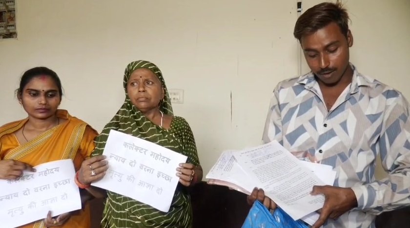 इस मामले में उसने थाने से लेकर कलेक्ट्रेट शिकायत की. लेकिन न्याय नहीं मिला. जिससे आहत होकर मंगलवार को सुशीला अपने बेटे और बेटी के साथ इच्छा मृत्यु की तख्ती लेकर कलेक्ट्रेट पहुंची. पीड़िता और उसके बेटे सोनू माहौर ने अपनी शिकायती आवेदन के साथ इच्छा मृत्यु की मांग कलेक्टर से की है. उनका कहना है कि मुकुंदी, उदयराज, रामू और रामकिशोर उनकी जमीन पर कब्जा किए हुए हैं.