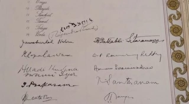 संविधान की इस प्रति में देश के पहले राष्ट्रपति डॉ. राजेन्द्र प्रसाद और प्रधानमंत्री जवाहरलाल नेहरू के हस्ताक्षर हैं.
