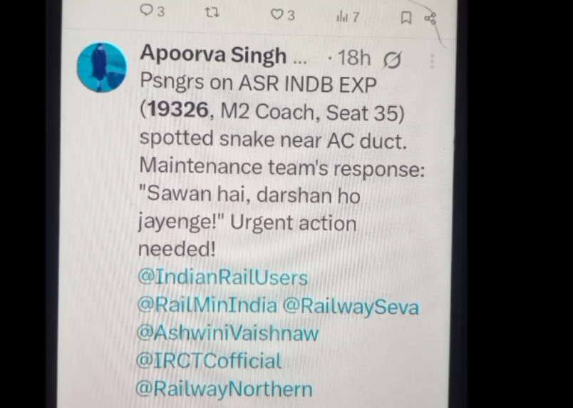 कर्ण मिश्रा, ग्वालियर। सावन का महीना चल रहा है और लोग भोलेनाथ की पूजा अर्चना कर रहे हैं। लेकिन इस दौरान यदि आपको कोई जहरीला सांप दिख जाए, ऐसे समय में मदद न करते हुए कोई यह बोले कि सावन का महीना है बाबा दर्शन देने आए हैं तो आपकी क्या हालत होगी। जी हां अमृतसर इंदौर एक्सप्रेस ट्रेन के AC कोच में ऐसा ही वाक्या हुआ। जिसकी शिकायत अब केंद्रीय रेल मंत्री अश्विनी वैष्णव तक की गई है।
