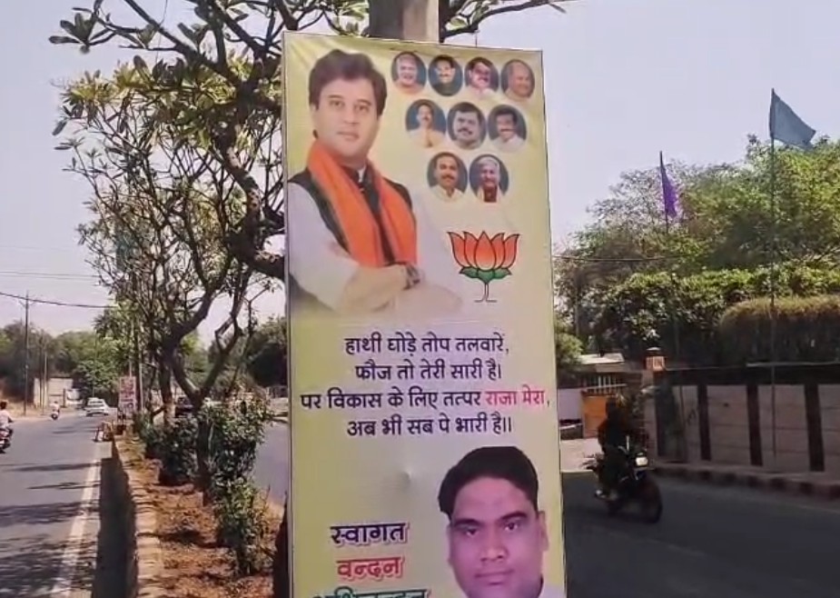 केंद्रीय मंत्री ज्योतिरादित्य सिंधिया शनिवार को ग्वालियर प्रवास पर आए हुए थे इस दौरान उनके कट्टर समर्थक पुरुषोत्तम बनोरिया ने उनके स्वागत में पोस्टर लगाए। लेकिन इन पोस्टरों ने सियासी गर्माहट को बढ़ा दिया है। क्योंकि पोस्टर में सिंधिया को “सिकंदर” बताते हुए राजनेताओं में सबसे भारी नेता बताया गया है। पहले पोस्टर में सिंधिया को स्किन्दर बताया गया है। पोस्टर में सिंधिया के फ़ोटो के साथ लिखा है” गरीब,शोषित,दलितों का सिंकदर”, दूसरे पोस्टर में सिंधिया के फोटो के साथ लिखा ” हाथी घोड़े तोप तलवारें, फ़ौज तो तेरी सारी है,पर विकास के लिए तत्पर राजा मेरा,अब भी सब पर भारी है”।