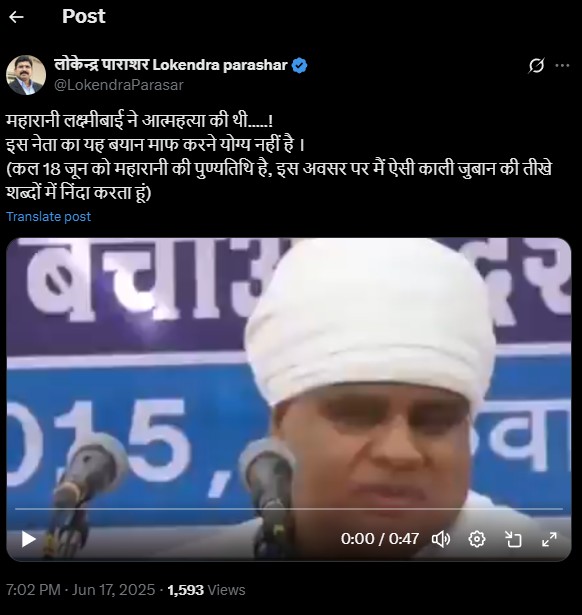 BJP प्रदेश मंत्री लोकेंद्र पाराशर ने वीडियो के जरिए फूल सिंह बरैया के लिए लिखा कि 18 जून महारानी की पुण्यतिथि है, इस मौके पर मैं ऐसी काली जुबान की तीखे शब्दों में निंदा करता हूं। बता दें कि फूल सिंह बरैया वर्तमान में कांग्रेस के विधायक है।