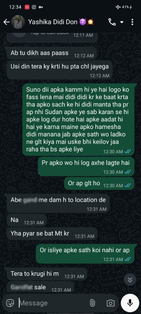 कॉल के अलावा, यशिका ने पीड़ित युवक को वॉट्सऐप पर मैसेज भेजे, जिसमें वह मारने की धमकी देते हुए लोकेशन मांग रही है। मैसेज में लिखा है कि वह युवक को ढूंढ निकालेगी और सजा देगी। ये मैसेज पीड़ित ने सबूत के तौर पर सेव रखे हैं, जो पुलिस जांच में अहम भूमिका निभा सकते हैं।