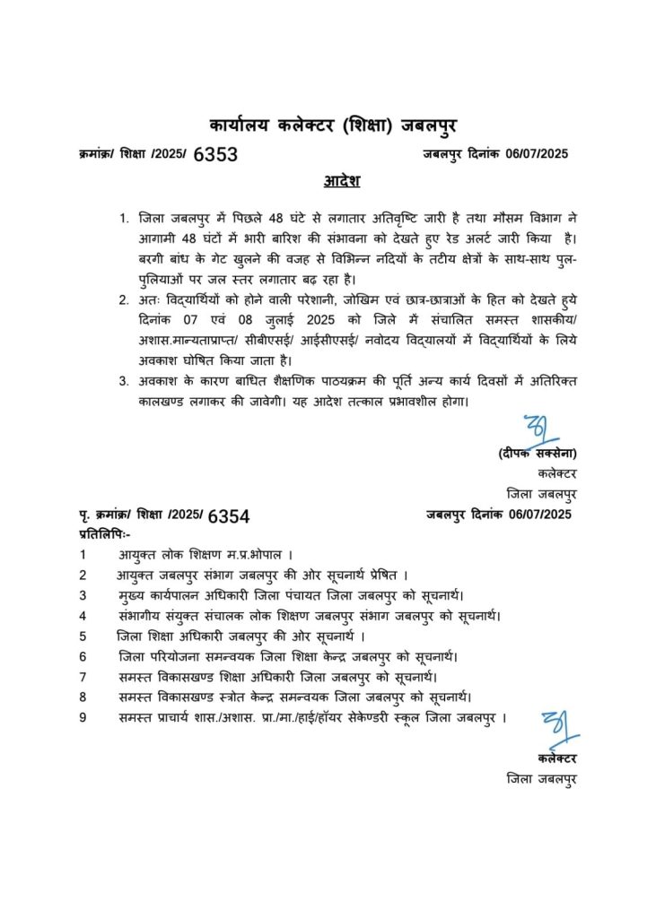 बता दें कि जबलपुर और आसपास के जिलों में लगातार हो रही बारिश के चलते आज ही बरगी डैम के 9 गेट खोले गए हैं। 21 में से 9 गेटों से 52 हज़ार 195 क्यूसेक पानी छोड़ा गया। नदी, नालों के तटीय क्षेत्रों और पुल पुलियों के जलस्तर बढ़ने के चलते विद्यार्थियों को होने वाली परेशानियों और जोखिम को देखते हुए प्रशासन ने फैसला लिया है।