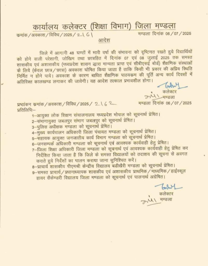 मंडला। भारी बारिश के कारण 7 एवं 8 जुलाई को मंडला में स्कूलों की छुट्टी घोषित कर दी गई है।