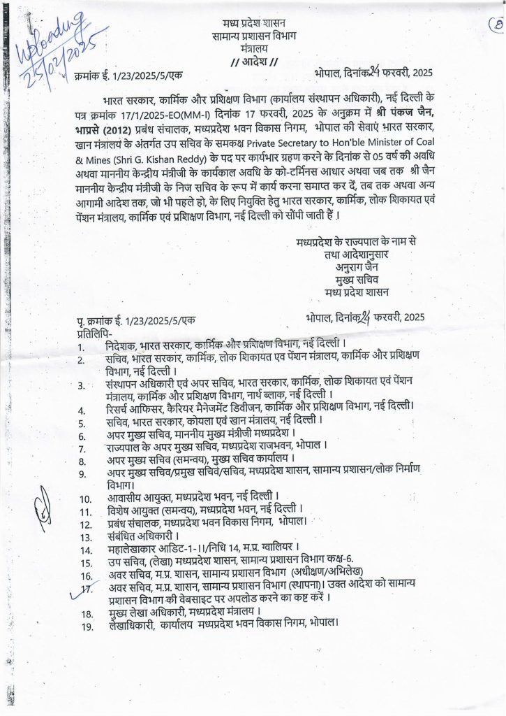 शब्बीर अहमद, भोपाल। MP IAS Pankaj jain: मध्य प्रदेश के चर्चित आईएएस अधिकारी 2012 बैच के आईएएस डॉ. पंकज जैन केंद्रीय प्रतिनियुक्ति पर दिल्ली जाएंगे। केंद्र सरकार ने उन्हें कोयला मंत्री जी किशन रेड्डी का प्राइवेट सेकेट्री बनाया है।