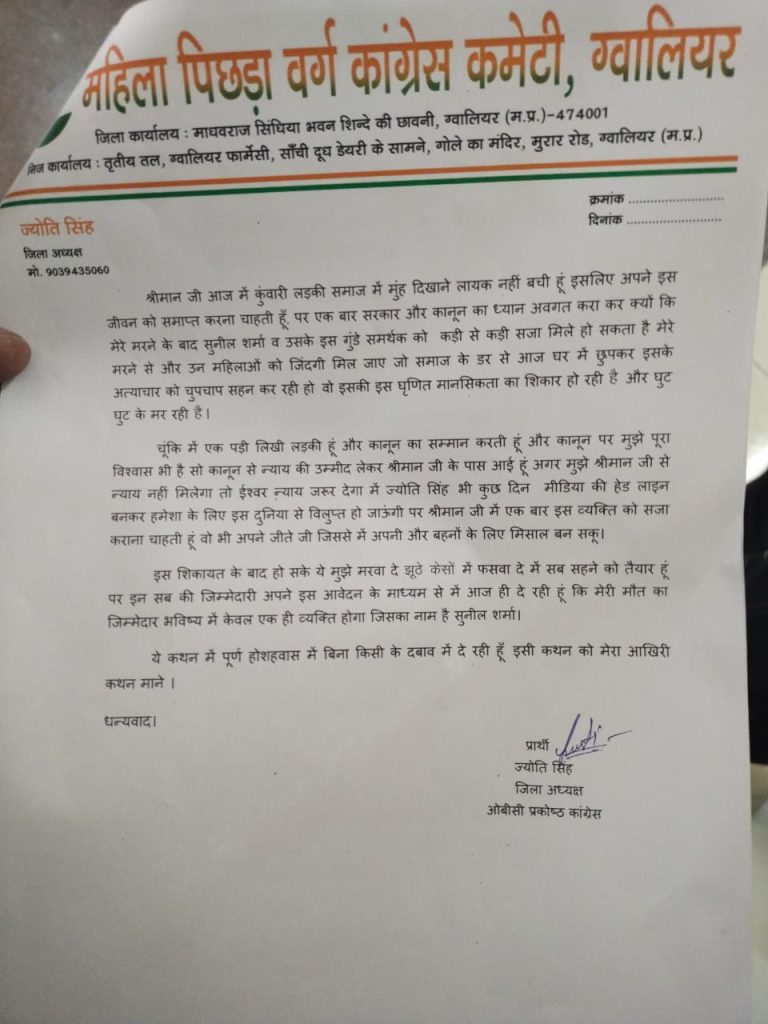 ग्वालियर SP ऑफिस में कांग्रेस पार्टी की पिछड़ा वर्ग प्रकोष्ठ महिला जिला अध्यक्ष ने प्रदेश महासचिव सुनील शर्मा पर आरोप लगाया है। महिला का आरोप है कि साल 2021 से सुनील शर्मा उसे लगातार मानसिक रूप से परेशान करते रहे है। उस वक्त पार्षद टिकट दिलाने के लिए सुनील शर्मा के करीबी पार्षद विकास जैन ने ऑफर दिया था कि यदि पार्षद टिकट चाहिए तो 10 लाख रुपये और सुनील शर्मा के साथ एक रात गुजारनी होगी। ऐसा न करने पर टिकिट नहीं दिलाया। अब सुनील शर्मा अपने लोगों के जरिये मुझे जगह जगह बदनाम कर रहे है। वह मानसिक और सामाजिक बदनाम कर रहे है। महिला ने पार्टी के लेटर पैड पर अपनी आपबीती लिख कर कार्रवाई की मांग की है। यह भी चेतावनी दी है कि यदि एक सप्ताह में कार्रवाई नहीं की गई तो वह अगले मंगलवार को SP ऑफिस में आत्मदाह करने मजबूर होगी।