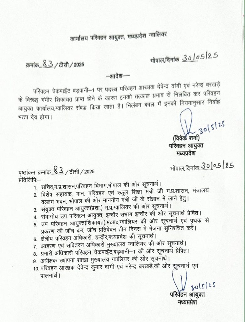सुधीर दंडोतिया, भोपाल। मध्यप्रदेश के परिवहन चौकी बड़वानी पर अवैध वसूली करने वाले दो आरक्षकों पर निलंबन की गाज गिरी है। आरक्षक देवेंद्र दांगी और नरेंद्र बरखेडे़ को परिवहन आयुक्त विवेक शर्मा ने निलंबित कर दिया है।