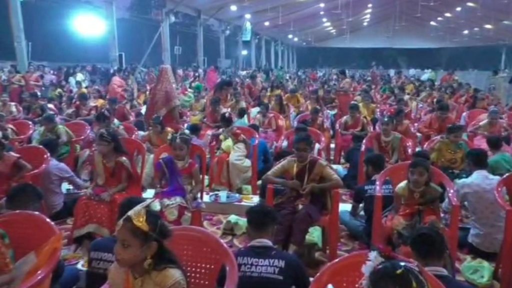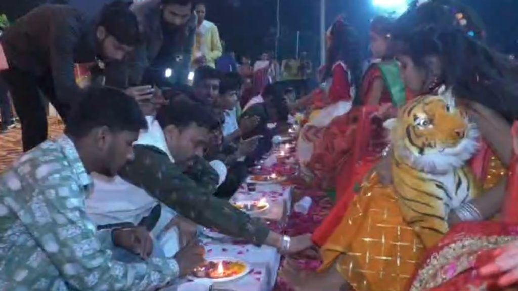 इंदौर के लालबाग पैलेस मैदान पर हिंदू आध्यात्मिक और सेवा संगठन ने 25000 कन्याओं का एक साथ महिषासुर मर्दिनी स्तोत्र का पाठ और 1000 कन्याओं का युवाओं और वरिष्ठ समाज सेवी द्वारा कन्या पूजन का आयोजन किया. इस आयोजन में बड़ी संख्या में शहर के अलग-अलग क्षेत्र से बच्चियों को बुलाया गया था. कार्यक्रम में समाजसेवी के साथ-साथ संत समाज और आरएसएस के पदाधिकारी भी मौजूद थे.