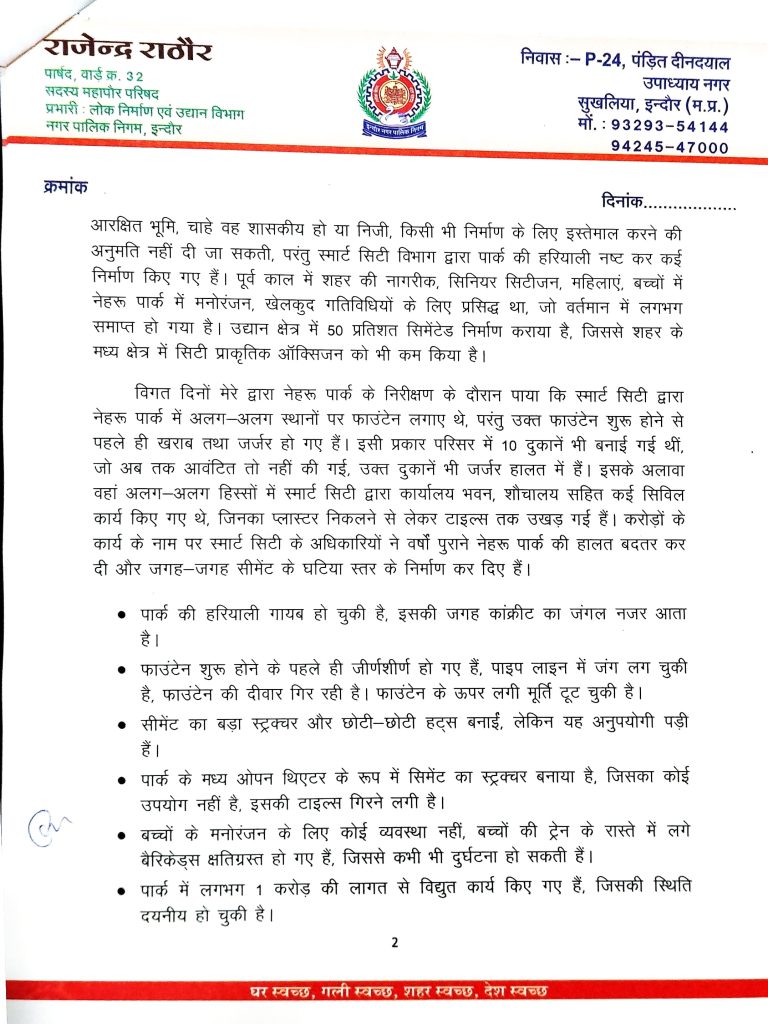 राजेंद्र राठौर ने चिट्ठी में यह लिखा कि पार्क की हरियाली गायब हो चुकी है, इसकी जगह कांक्रीट का जंगल नजर आता है. फाउंटेन शुरू होने के पहले ही जीर्णशीर्ण हो गए हैं, पाइप लाइन में जंग लग चुकी है, फाउंटेन की दीवार गिर रही है. फाउंटेन के ऊपर लगी मूर्ति टूट चुकी है. सीमेंट का बड़ा स्ट्रक्चर और छोटी-छोटी हट्स बनाईं, लेकिन यह अनुपयोगी पड़ी हैं.