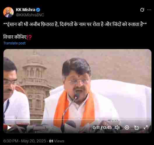 कांग्रेस के वरिष्ठ नेता केके मिश्रा ने विजयवर्गीय के बयान को लेकर सोशल मीडिया पर तंज कसा है। उन्होंने लिखा- “इंसान की भी अजीब फितरत है। दिवंगतों के नाम पर रोता है और जिंदों को रुलाता है।”