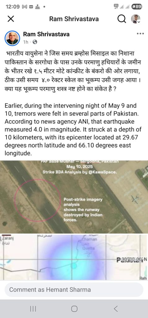 हेमंत शर्मा, इंदौर। वैज्ञानिक राम श्रीवास्तव ने अपने सोशल मीडिया अकाउंट पर एक सनसनीखेज दावा किया है, जो चर्चा का विषय बन गया है। राम श्रीवास्तव ने अपनी फेसबुक और एक्स पर एक पोस्ट में दावा किया है कि भारतीय वायुसेना द्वारा ब्रह्मोस मिसाइल का निशाना पाकिस्तान के सरगोधा के पास उनके परमाणु हथियारों के बंकरों की ओर लगाया गया था। उनके अनुसार, जिस समय ब्रह्मोस मिसाइल का निशाना पाकिस्तान के सरगोधा स्थित भूमिगत परमाणु बंकरों पर लगाया गया, उसी समय वहां 4.0 रिक्टर स्केल का भूकंप दर्ज किया गया। उन्होंने इस भूकंप को एक असामान्य घटना बताया और सवाल उठाया कि क्या यह भूकंप वास्तव में पाकिस्तान के परमाणु शस्त्रों के नष्ट होने का संकेत हो सकता है?