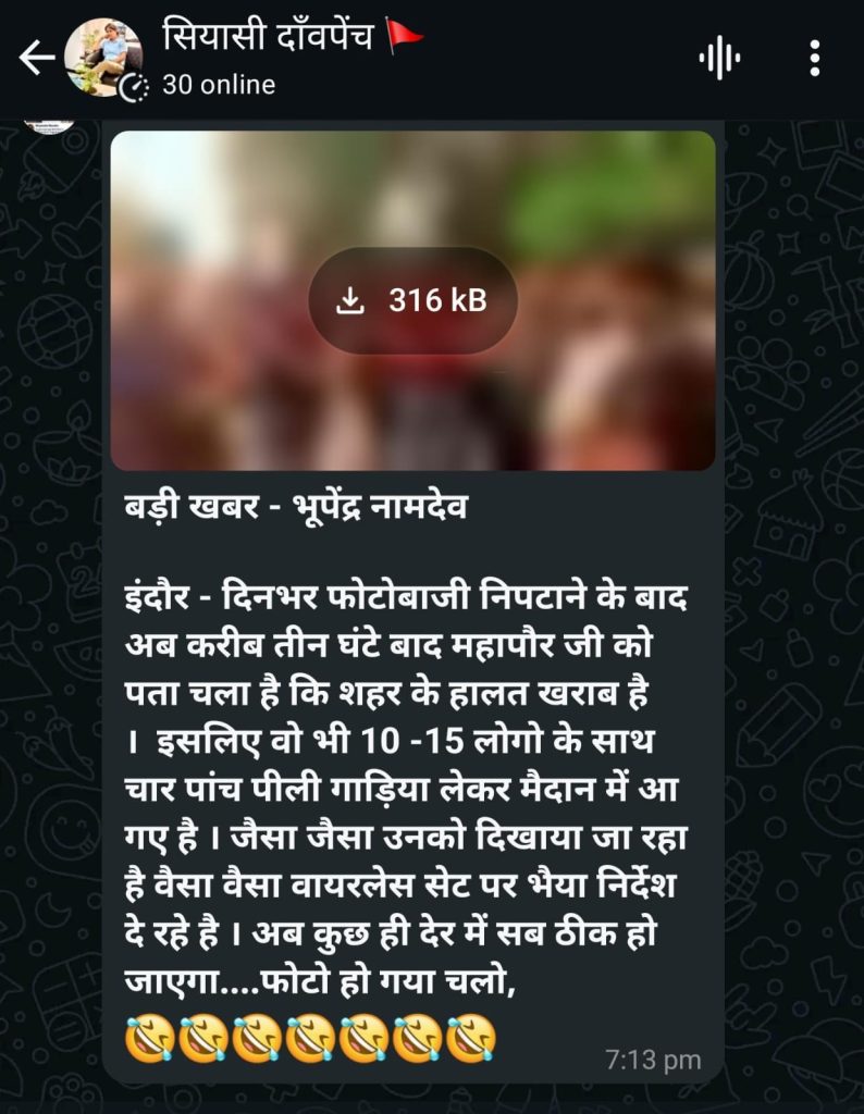 बारिश के बाद इंदौर महापौर पुष्यमित्र भार्गव जलभराव की स्थिति का मुआयना करने पहुंचे तो लोगों ने उन पर तंज कसा। व्हाट्सएप पर एक शख्स ने लिखा, “दिनभर फोटोबाजी निपटाने के बाद अब करीब तीन घंटे बाद महापौर जी को पता चला है कि शहर के हालत खराब है। इसलिए वो भी 10 -15 लोगो के साथ चार-पांच पीली गाड़िया लेकर मैदान में आ गए हैं। जैसा-जैसा उनको दिखाया जा रहा है, वैसा वैसा वायरलेस सेट पर भैया निर्देश दे रहे हैं। अब कुछ ही देर में सब ठीक हो जाएगा….फोटो हो गया चलो।”