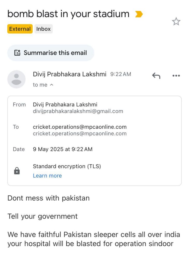 ईमेल में लिखा गया कि हम पाकिस्तान की स्लीपर सेल से हैं, जो ऑपरेशन सिंदूर किया है. इस तरह का क्लेश ना करें. वरना अच्छा नहीं होगा. हालांकि, जब स्टेडियम की तलाशी ली गई तो किसी भी प्रकार का संदिग्ध सामान नहीं मिला है. वहीं, इस मामले की जांच में क्राइम ब्रांच की टेक्निकल टीम जुटी हुई है. पता लगाया जा रहा है कि आखिर ईमेल कहां से भेजा गया था.