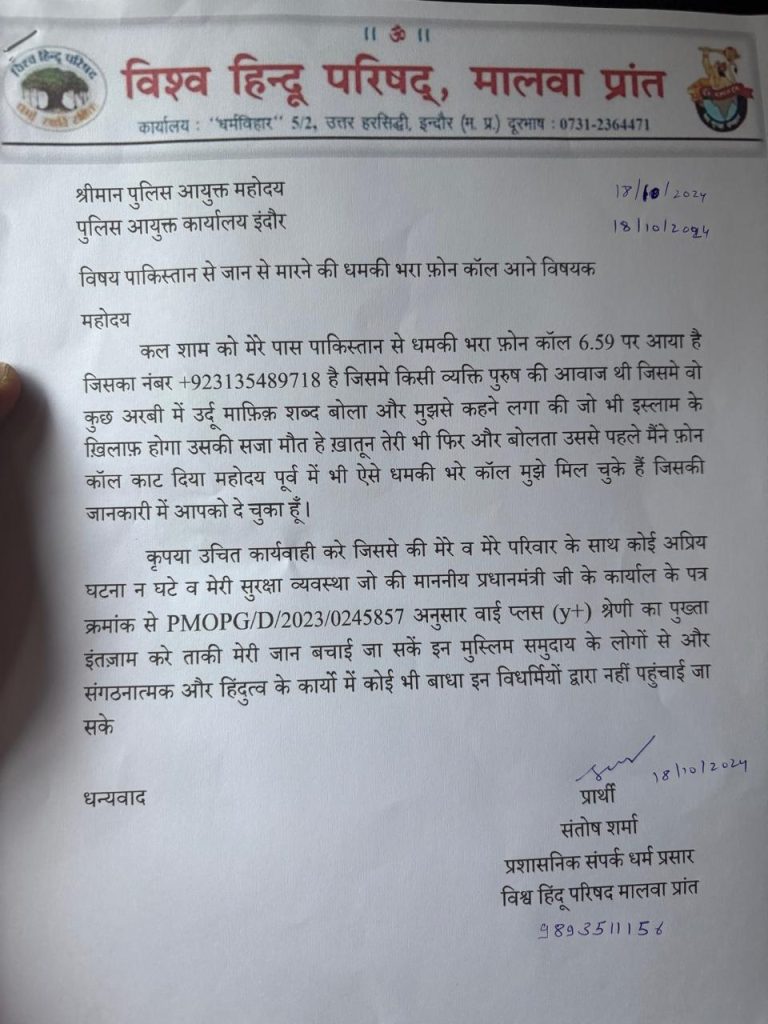 हेमंत शर्मा, इंदौर। मध्य प्रदेश के इंदौर में विश्व हिंदू परिषद के संपर्क प्रचारक संतोष शर्मा को धमकी भरा कॉल आया है। फोन करने वाले शख्स ने कहा कि ‘जो भी इस्लाम के खिलाफ, उसकी सजा मौत होगी खातून तेरी भी।’ यह धमकी कल शाम को पाकिस्तान के एक नंबर से दी गई है।