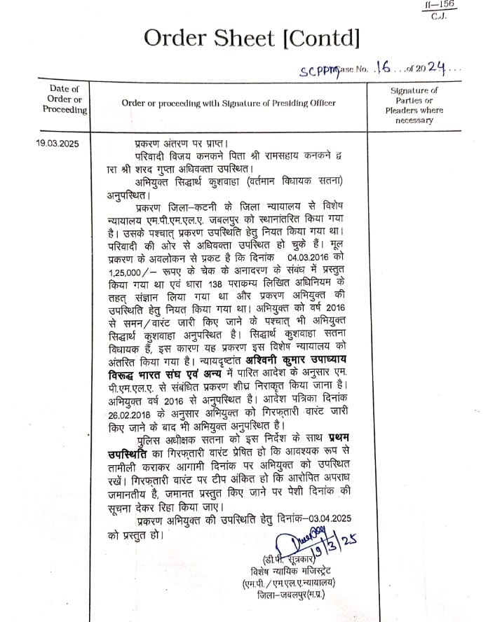 दरअसल, कांग्रेस विधायक सिद्धार्थ कुशवाहा को साल 2016 से लगातार समन जारी किए जा रहे थे। कोर्ट के बार-बार समन भेजने के बाद भी वे हाजिर नहीं हो रहे थे। जिसके बाद आज जबलपुर के विशेष न्यायिक मजिस्ट्रेट एमपी एमएलए कोर्ट से आदेश जारी हुआ है।