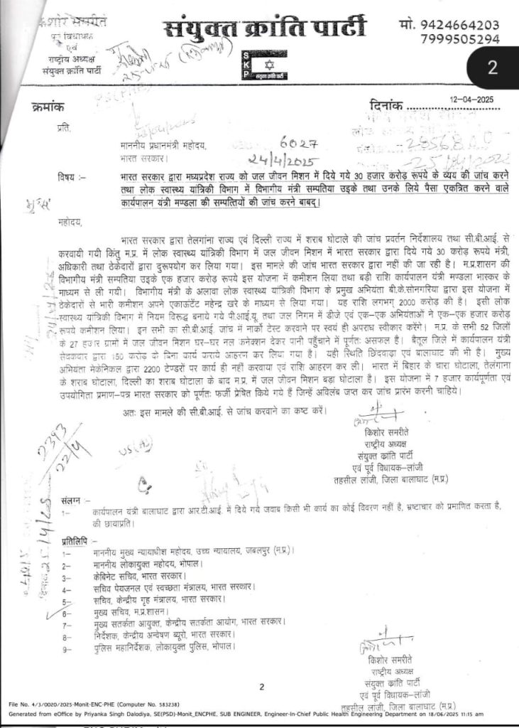 उन्होंने यह भी कहा कि “मध्य प्रदेश में 27 हजार गांव में इस योजना से पैसा लगाया गया एक बूंद पानी नहीं मिला। जितने जांच करने वाले नोडल अधिकारी थे, ठेकेदारों पर नियंत्रण करना था, गुणवत्ता पर ध्यान देना था। सारे एग्जीक्यूटिव इंजीनियर के पास SE होते थे, जिसकी जिम्मेदारी ठेकेदार के समय पर काम न करने पर पेनाल्टी लगाना था। किसी ने पेनाल्टी नहीं लगाई। जबकि हर ठेकेदार से 25 लाख रुपए लेकर समय अवधि बढ़ाने के लिए कमीशन लेते रहे। सबसे ज्यादा यह जबलपुर और रीवा में हुआ। अगर सरकार इसकी CBI जांच होती है तो लगभग 54 कार्यपालन यंत्री, मेकेनिकल विंग के 9 डिवीजन के EE और काफी लोग इसमें बंद होंगे। यह एमपी का बहुत बड़ा घोटाला है। अगर सीबीआई जांच हुई तो मंत्री संपतिया उइके की गिरफ्तारी भी संभव है।”