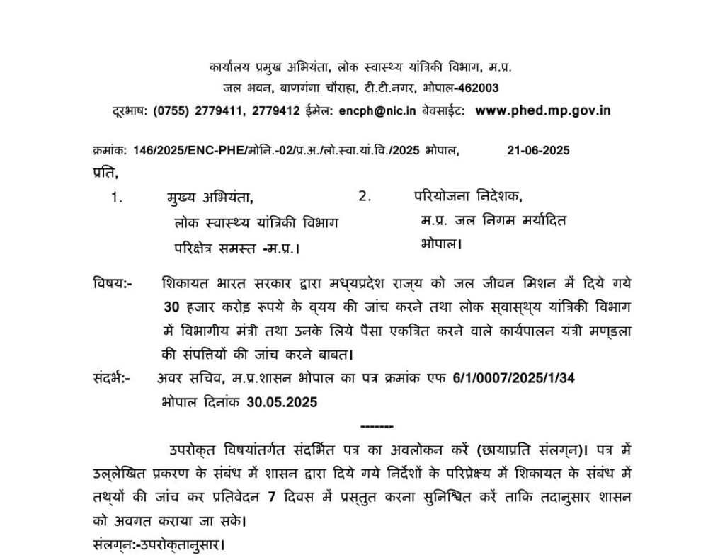 भारत सरकार से शिकायत के बाद प्रमुख अभियंता ने मुख्य अभियंता को पत्र लिखा है। शिकायत में जल जीवन मिशन में दिए गए 30 हजार करोड़ की जांच और मंत्री के लिए पैसा एकत्रित करने वाले कार्य यंत्री के खिलाफ जांच के आदेश दिए हैं।शिकायत के बारे में जांच करके सात दिन में रिपोर्ट देने के निर्देश दिए हैं। मुख्य अभियंता और प्रोजेक्ट डायरेक्टर को भी जांच के लिए शामिल किया गया है।