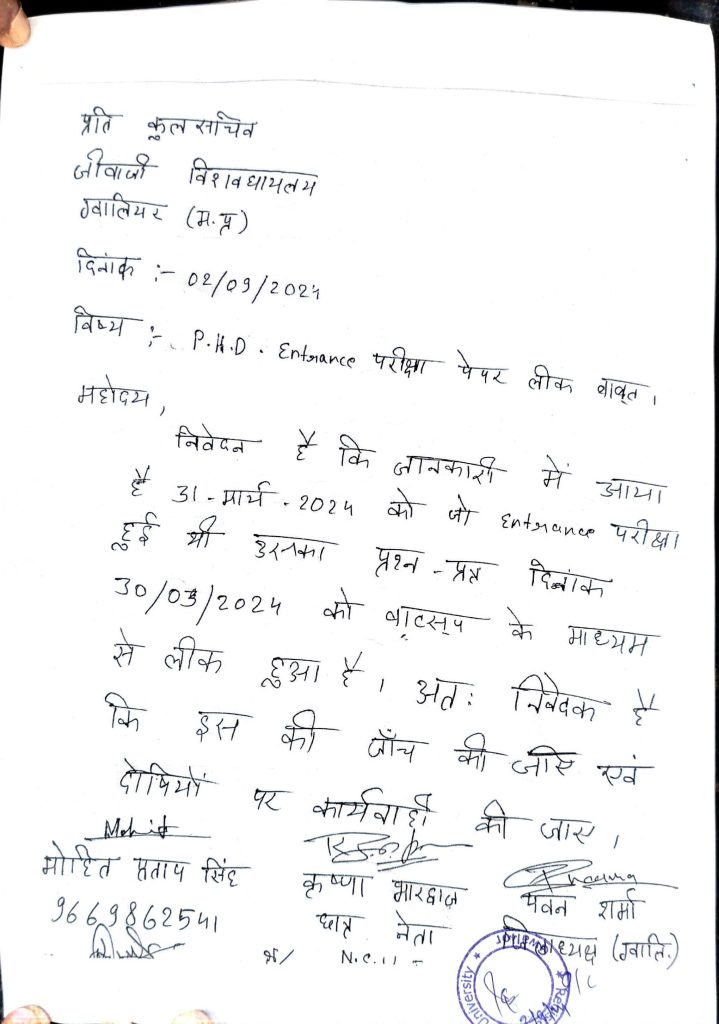 NSUI जिलाध्यक्ष पवन शर्मा का आरोप है कि जीवाजी यूनिवर्सिटी में पीएचडी एंट्रेंस परीक्षा का पेपर लीक हुआ है. पवन शर्मा के मुताबिक, 31 मार्च 2024 को ग्वालियर में जीवाजी यूनिवर्सिटी पीएचडी एंट्रेंस परीक्षा का आयोजन हुआ था. लेकिन भ्रष्टाचार में लिप्त यूनिवर्सिटी के कर्मचारी-अधिकारियों ने मिलकर इस परीक्षा का पेपर 30 मार्च को ही लीक कर दिया था. इसके पुख्ता सबूत भी उनके पास हैं. यही वजह है कि NSUI ने जीवाजी यूनिवर्सिटी के रजिस्ट्रार अरुण चौहान को ज्ञापन के साथ इस पेपर लीक कांड की जांच और दोषियों पर कार्रवाई की मांग की है. इसके साथ ही NSUI ने तत्काल पीएचडी एंट्रेंस परीक्षा को निरस्त करने की मांग भी की है.