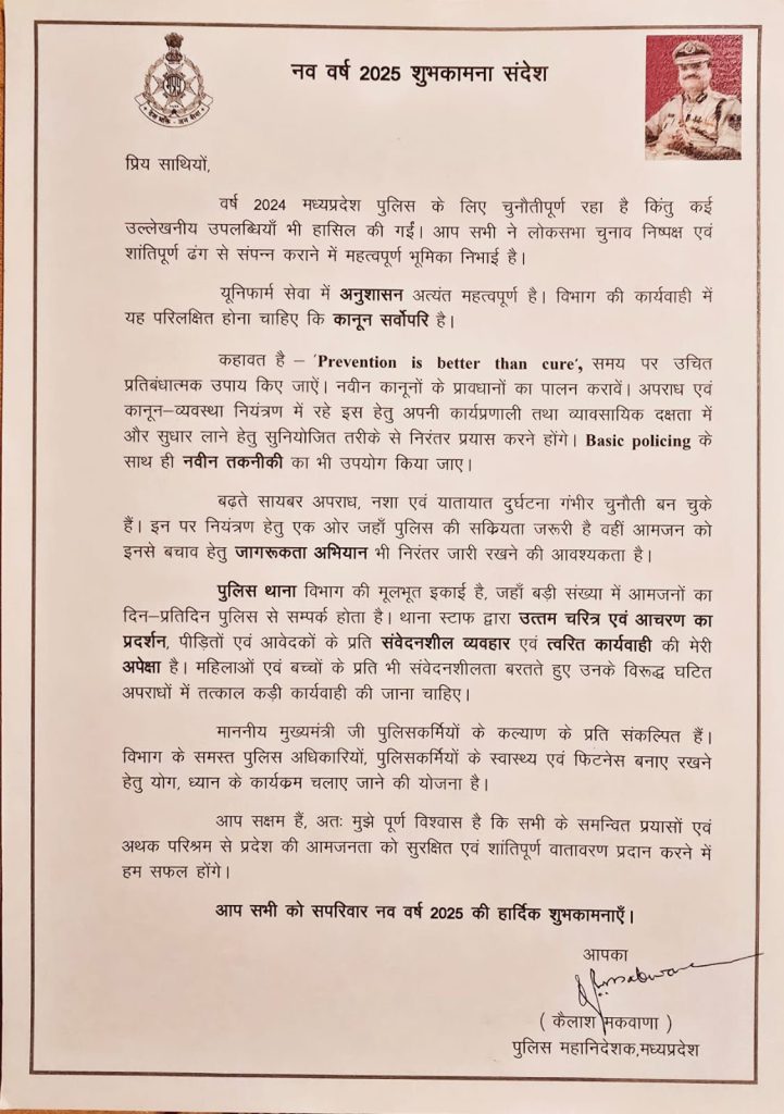 DGP कैलाश मकवाना ने संदेश में लिखा- कहावत है- ‘Prevention is better than cure’, समय पर उचित प्रतिबंधात्मक उपाय किए जाऐं। नवीन कानूनों के प्रावधानों का पालन करावें। अपराध एवं कानून-व्यवस्था नियंत्रण में रहे इस हेतु अपनी कार्यप्रणाली तथा व्यावसायिक दक्षता में और सुधार लाने हेतु सुनियोजित तरीके से निरंतर प्रयास करने होंगे। Basic policing के साथ ही नवीन तकनीकी का भी उपयोग किया जाए। DGP ने लिखा- बढ़ते सायबर अपराध, नशा एवं यातायात दुर्घटना गंभीर चुनौती बन चुके हैं। इन पर नियंत्रण हेतु एक ओर जहाँ पुलिस की सक्रियता जरूरी है वहीं आमजन को इनसे बचाव हेतु जागरूकता अभियान भी निरंतर जारी रखने की आवश्यकता है।