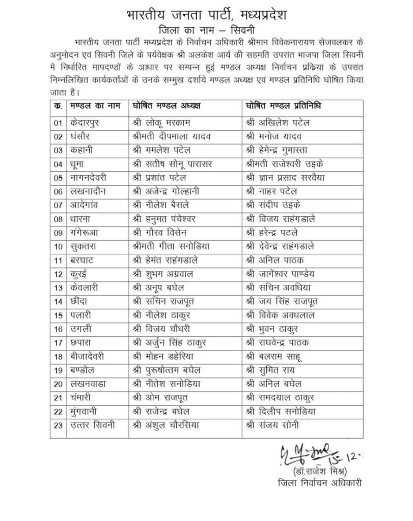 निशांत राजपूत, सिवनी। मध्यप्रदेश में भारतीय जनता पार्टी (बीजेपी) के मंडल अध्यक्षों की चुनाव प्रक्रिया जारी है। इसी कड़ी में प्रदेश के सिवनी जिले के मंडल अध्यक्षों की सूची जारी कर दी गई है। जिले में सम्पन्न भाजपा मण्डल अध्यक्ष निर्वाचन प्रक्रिया के बाद 23 मण्डल अध्यक्ष सर्व सम्मति से निर्वाचित किए गए हैं।