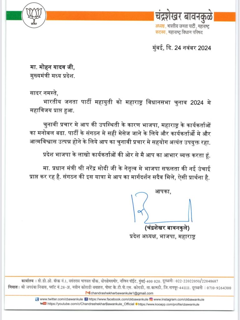 राकेश चतुर्वेदी, भोपाल। मध्यप्रदेश के मुख्यमंत्री डॉ. मोहन यादव ने महाराष्ट्र विधानसभा चुनाव में स्टार प्रचारक के रूप में भारतीय जनता पार्टी महायुति के पक्ष में जोरदार चुनाव प्रचार किया। नतीजा सबके सामने है। मुख्यमंत्री की लोकप्रिय और तेज-तर्रार प्रचार शैली से महाराष्ट्र के भाजपा प्रदेश अध्यक्ष चंद्रशेखर बावनकुले भी प्रभावित हुए। उन्होंने मुख्यमंत्री डॉ. यादव को चिट्ठी लिखकर आभार व्यक्त किया है। बावनकुले ने अपनी चिट्ठी में लिखा कि ‘चुनाव प्रचार में आपकी सशक्त उपस्थिति के कारण भाजपा महाराष्ट्र के कार्यकर्ताओं का मनोबल बढ़ा, पार्टी संगठन में सही मैसेज दिये जाने और कार्यकर्ताओं में उत्पन्न आत्मविश्वास की वजह से आपका चुनावी प्रचार में सहयोग अत्यंत उपयुक्त रहा।’