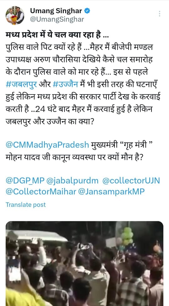 इस मामले को लेकर नेता प्रतिपक्ष उमंग सिंघार ने सरकार को घेरा है। उन्होंने सोशल मीडिया प्लेटफॉर्म एक्स पर लिखा, “मध्य प्रदेश में ये चल क्या रहा है? पुलिस वाले पिट क्यों रहे हैं ? मैहर मैं बीजेपी मंडल उपाध्यक्ष अरुण चौरसिया देखिये कैसे चल समारोह के दौरान पुलिस वाले को मार रहे हैं। इससे पहले जबलपुर और उज्जैन में भी इसी तरह की घटनाएं हुई। लेकिन मध्य प्रदेश की सरकार पार्टी देख कार्रवाई करती है। 24 घंटे बाद मैहर में करवाई हुई है। लेकिन जबलपुर और उज्जैन का क्या? मुख्यमंत्री “गृह मंत्री ” मोहन यादव जी कानून व्यवस्था पर क्यों मौन है?