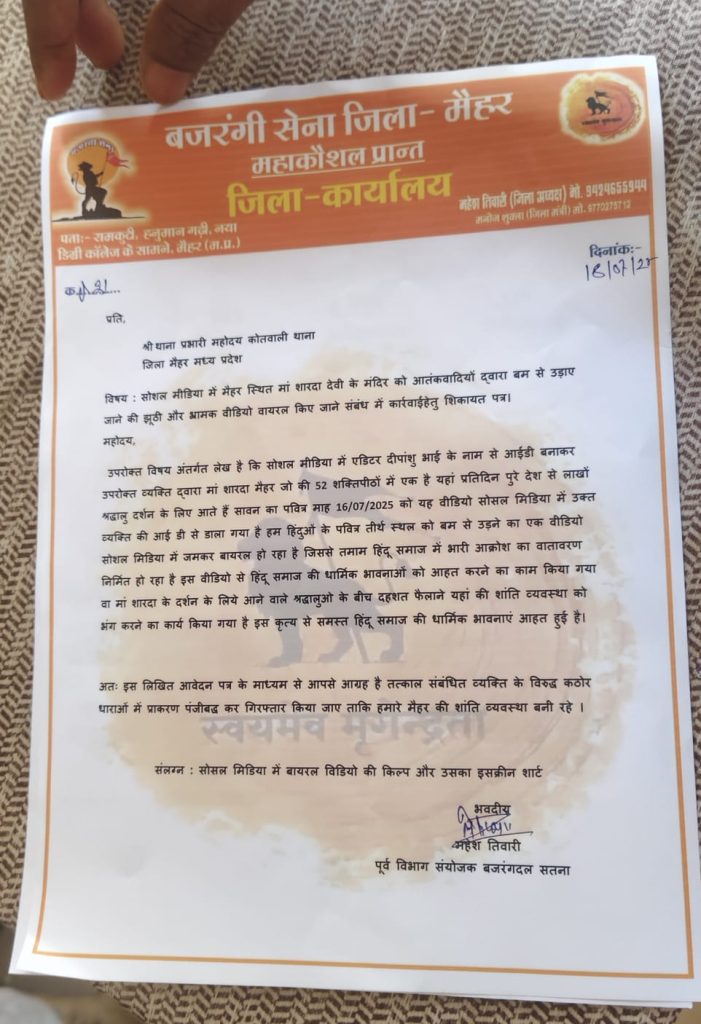 बता दें कि मैहर का मां शारदा मंदिर, देश के प्रसिद्ध शक्तिपीठों में से एक है। जिसे लेकर शर्मनाक और खतरनाक साजिश का वीडियो सोशल मीडिया पर वायरल हो रहा है। बजरंगी सेना ने पुलिस को एक शिकायत पत्र सौंपा है। जिसमें बताया गया है कि ‘एडिटर दीपांशु भाई’ नाम के सोशल मीडिया अकाउंट से इस वीडियो को जारी किया गया है।