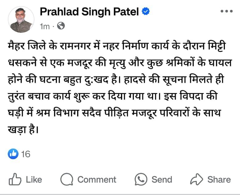 मंत्री प्रहलाद पटेल ने मैहर जिले के रामनगर थाना क्षेत्र में हुई घटना पर गहरा दुख जताते हुए सोशल मीडिया प्लेटफॉर्म फेसबुक पर पोस्ट करते हुए मृतक और घायल मजदूरों के प्रति अपनी संवेदनाएं व्यक्त की।