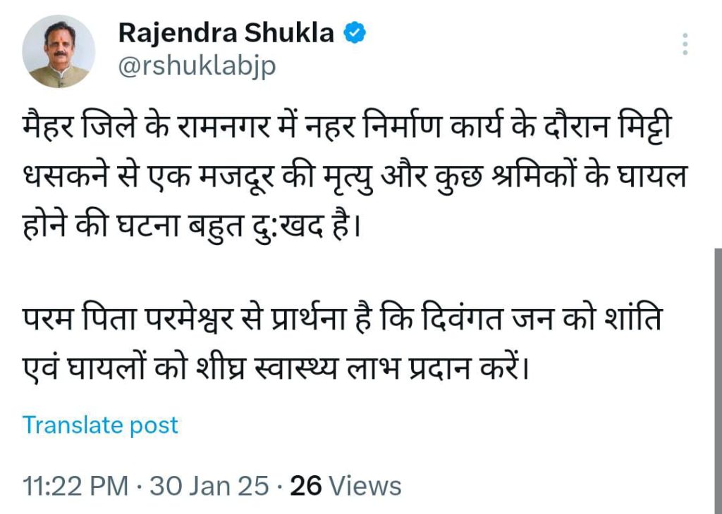 उप मुख्यमंत्री राजेन्द्र शुक्ला ने भी जताया शोक