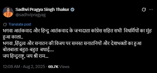 भाजपा की पूर्व सांसद साध्वी प्रज्ञा ठाकुर ने सोशल मीडिया प्लेटफॉर्म एक्स पर लिखा, “भगवा आतंकवाद और हिन्दू आतंकवाद के जन्मदाता कांग्रेस सहित सभी विधर्मियों का मुंह हुआ काला। भगवा ,हिंदुत्व और सनातन की विजय पर समस्त सनातनियों और देशभक्तों का हुआ बोलबाला। बहुत-बहुत बधाई।जय हिन्दूराष्ट्र, जय श्री राम।