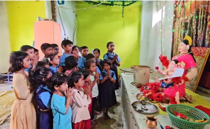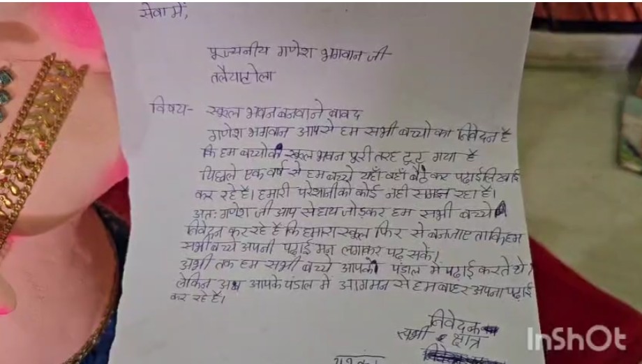 जिसके बाद बच्चों को गणेश पंडाल मे ही रहकर पढ़ाई करनी पड़ रही है। वहीं शिक्षक तखत पर बैठाकर गणपति की प्रतिमा के सामने उन्हें शिक्षा दे रहे हैं। स्कूली बच्चों का कहना है कि सभी समस्याओं की जानकारी प्रशासन समेत जनप्रतिनिधियो को दी गई। लेकिन अब तक कोई कार्यवाही नहीं हुई।