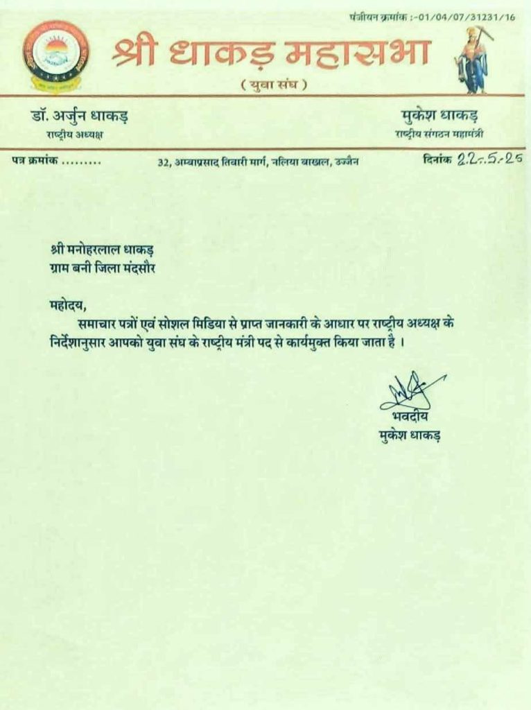 दरअसल, धाकड़ महासभा (युवा संघ) के राष्ट्रीय अध्यक्ष अर्जुन धाकड़ ने उसे लेकर आदेश जारी। जिसमें उन्होंने लिखा, “श्री मनोहरलाल धाकड़ ग्राम बनी जिला मंदसौर, महोदय, समाचार पत्रों एवं सोशल मीडिया से प्राप्त जानकारी के आधार पर राष्ट्रीय अध्यक्ष के निर्देशानुसार आपको युवा संघ के राष्ट्रीय मंत्री पद से कार्यमुक्त किया जाता है।”